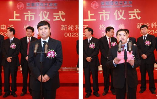 寶安區人民政府副區長王立新先生和格林美董事長許開華先生以及積成電子和新綸科技兩家企業共同敲響開市寶鐘