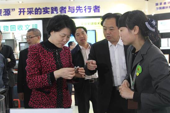 圖1. 荊門市政府市長肖菊華(左一)、在副市長鄭中華(左二)等領導的陪同下,參觀荊門格林美循環展廳