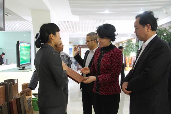 圖3.肖菊華市長(右二)對格林美公司循環再造的新型環保材料—塑木型材給予贊賞