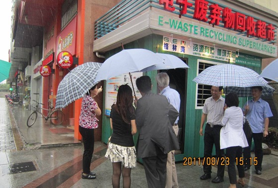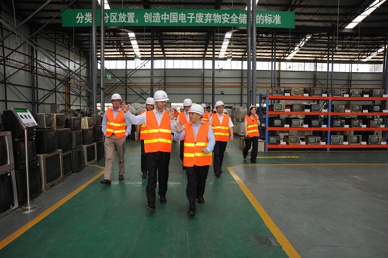 圖四 伯納德.??怂瓜壬ㄇ白笠唬⒃S開華董事長(前右一)等參觀武漢分公司電子廢棄物倉庫